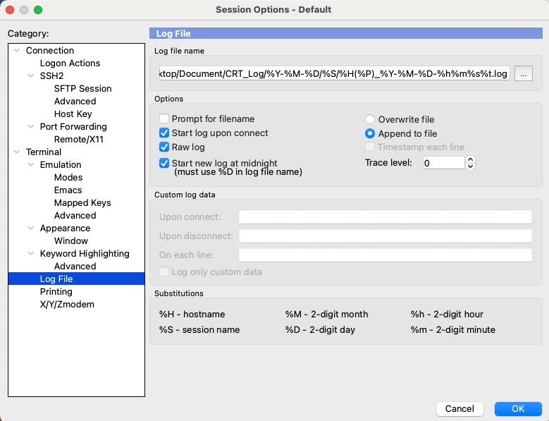 填写“On each line”可在每行记录前增加操作时间,如[%Y-%M-%D %h:%m:%s]。