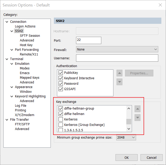 SecureCRT在连接会话时,会卡一段时间,打开诊断后,发现是卡在Kerberos密钥交换,尝试后发现仅保留diffie-hellman*后,连接秒开,无卡顿。