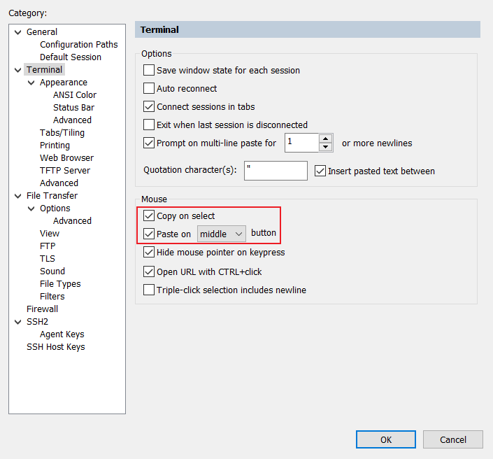 - Terminal > Mouse> Key exchange ;